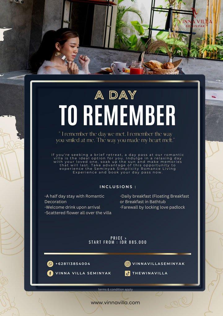 If you’re seeking a brief retreat, a day pass at our romantic villa is the ideal option for you. Sample the simplicity and romantic atmosphere of Seminyak living with our luxurious amenities, with a private pool, private cabana and full set kitchenette, without needing to spend a night. Indulge in a relaxing day with your loved one, soak up the sun and make memories that will last. Take advantage of this opportunity to experience the Seminyak Simplicity Romance Living Experience and book your day pass now.